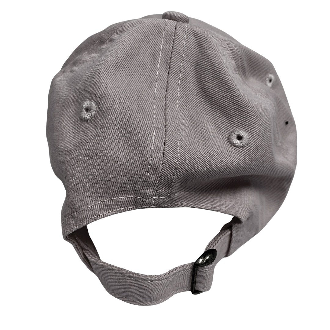 100% cotton cap, with adjustable hook and loop in the back. The attached canvas patch features a frayed edge and is off-white in color.